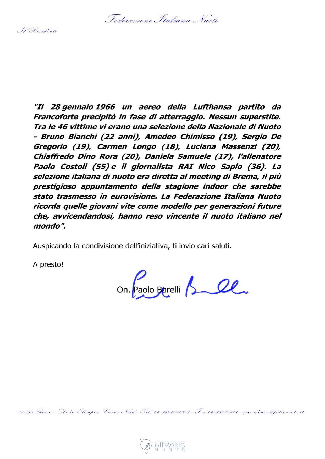 A 60 anni da una delle più grandi tragedie dello sport italiano, la Federazione Italiana Nuoto e tutte le Società Sportive ad essa affiliate, ricordano il disastro aereo del 28 gennaio 1966, in cui persero la vita i membri della nazionale italiana di nuoto. Tra questi il dorsista veneziano Amedeo Chimisso. In loro memoria, la Federazione ha istituito il Campionato Nazionale a Squadre - Coppa Caduti di Brema, che porta il loro nome ed è ancora oggi uno degli appuntamenti più sentiti della stagione. Affinchè anche i più giovani atleti ne conoscano la storia, ci uniamo al ricordo con il nostro Presidente Paolo Barelli.